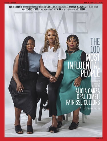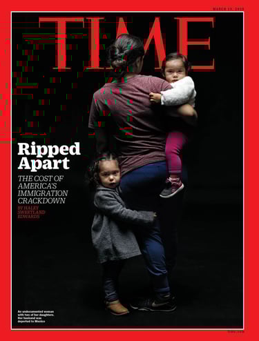 Left to right: TIME magazine covers featuring the Stop Asian Hate movement, Black Lives Matter founders, and immigration crackdown on families and individuals during the Trump administration